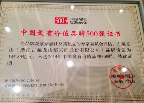 与此同时,《品牌观察》杂志还揭晓2014年中国最有价值品牌500强榜单。中国工商银行以2691亿元的品牌价值排第1名,古越龙山以145.85亿元的品牌价值名列第169位。