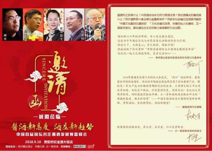 因为,这场盛大活动可谓“精彩纷呈”:既会展现白酒品类风口,又将介绍一种崭新发展模式;既能接受一场文化洗礼,又能见证一场智慧盛宴;同时,这是一场不容错过的财富机遇!这就是——“中国首届国坛名庄酱酒发展财富峰会”。