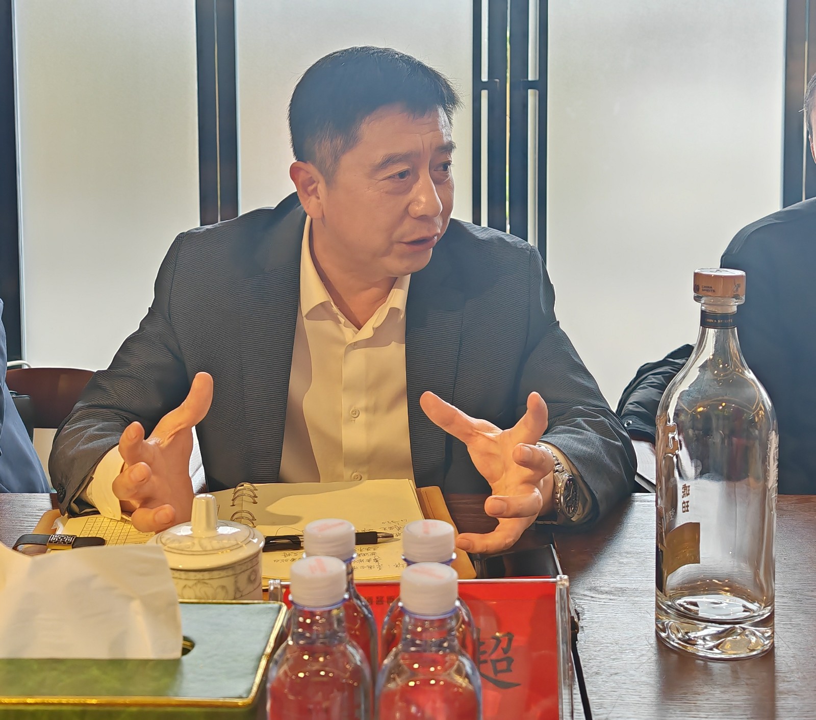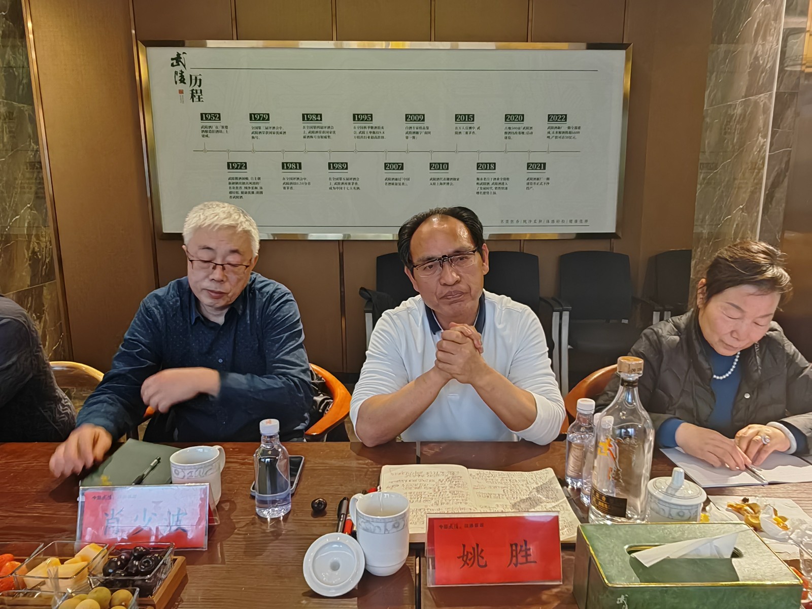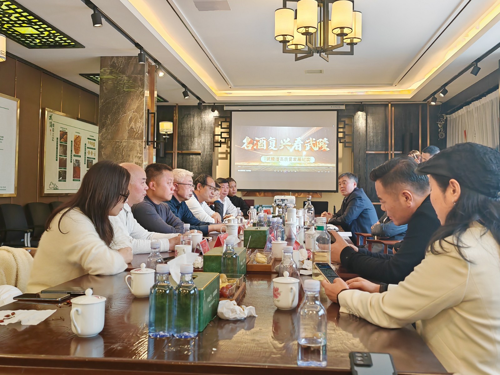 武陵酒业总经理张毅超向考察团详细介绍了武陵酒的发展历程与酒文化渊源。作为湖南唯一的中国名酒,武陵酒在1972年由工程师团队师法传统酱香白酒工艺,并加以自主创新,成功研发出具有“名贵焦香、纯净柔和、体感轻松、健康优雅”独特风格的酱香型武陵酒。